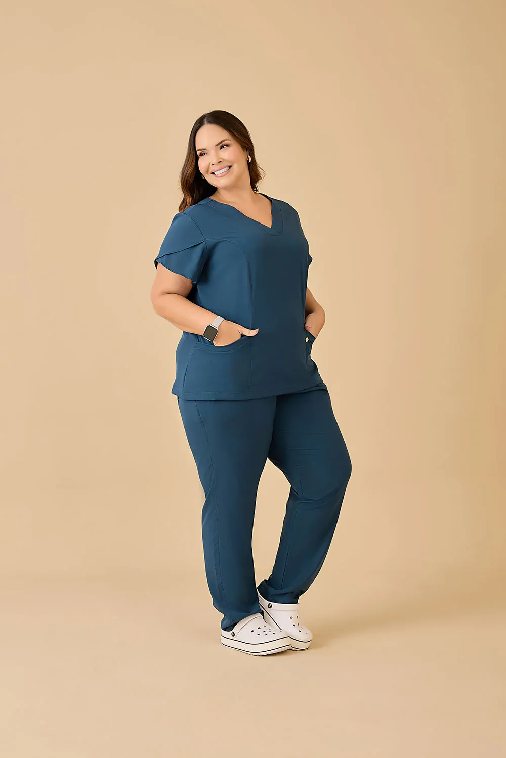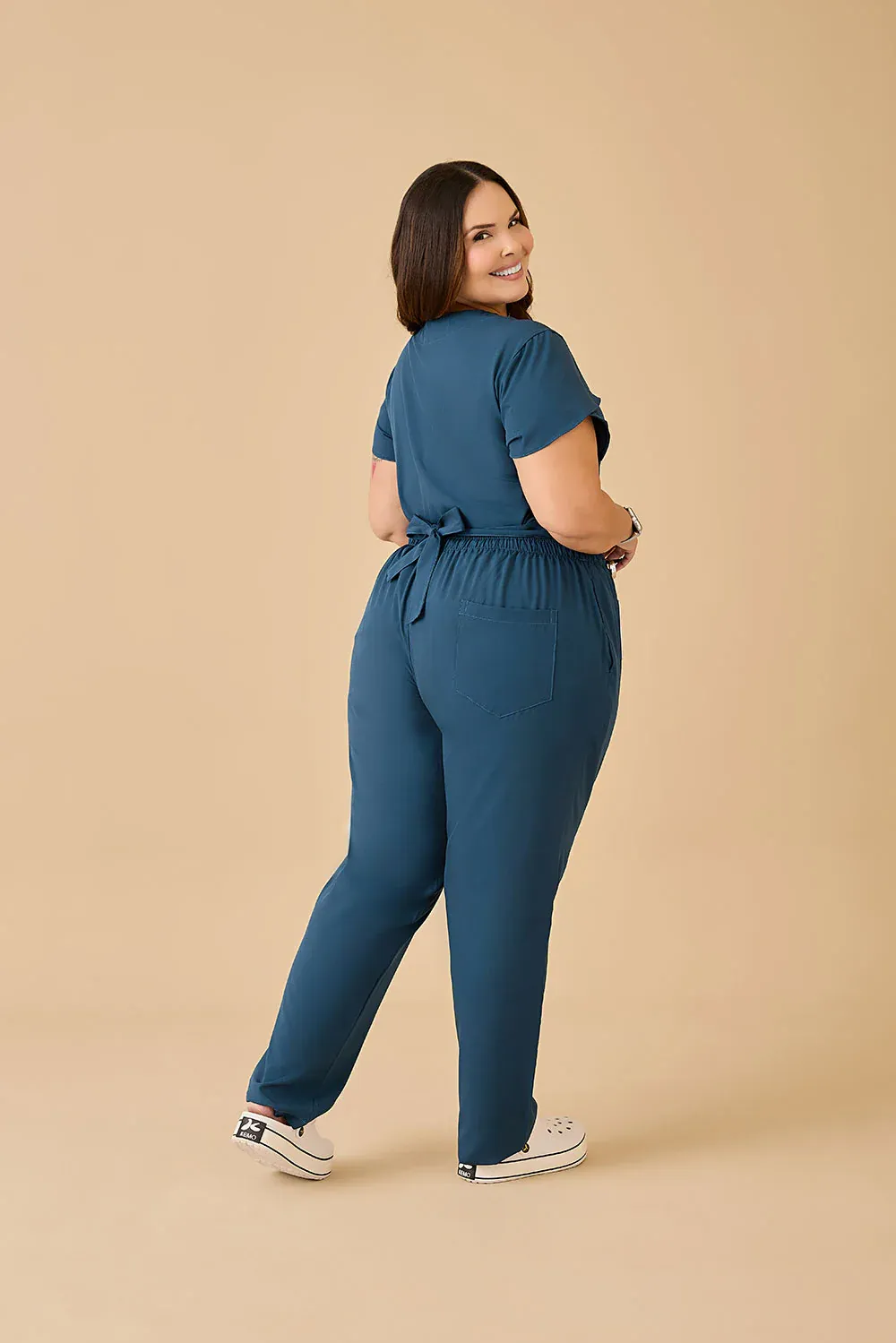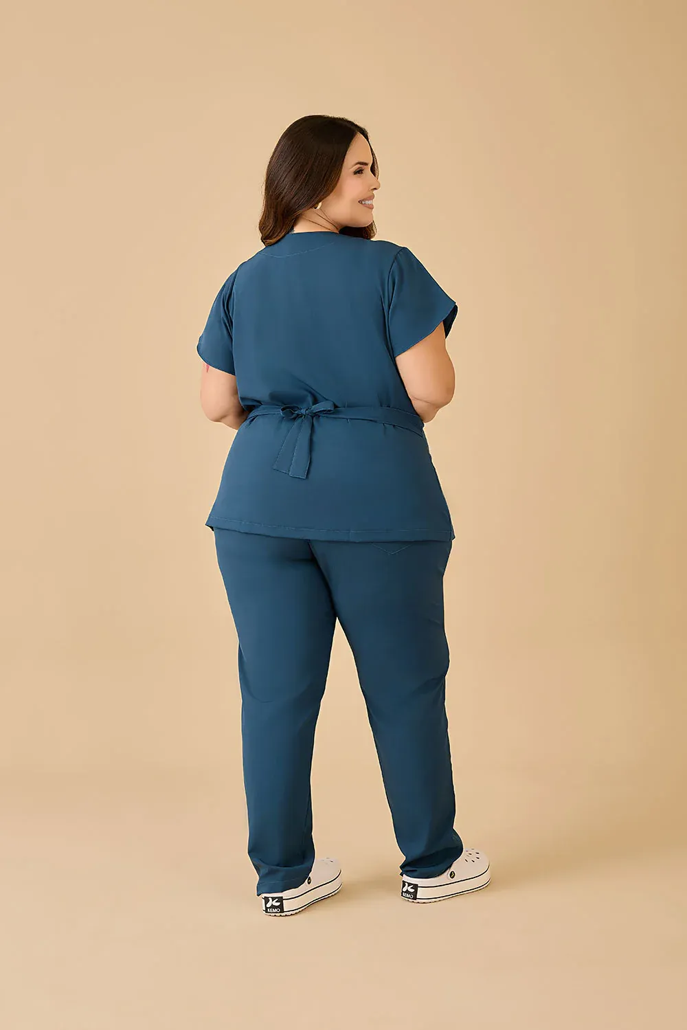 Calça reta com cintura de elástico, dois bolsos frontais e um traseiro do lado direito. Conforto e estilo para a rotina profissional.