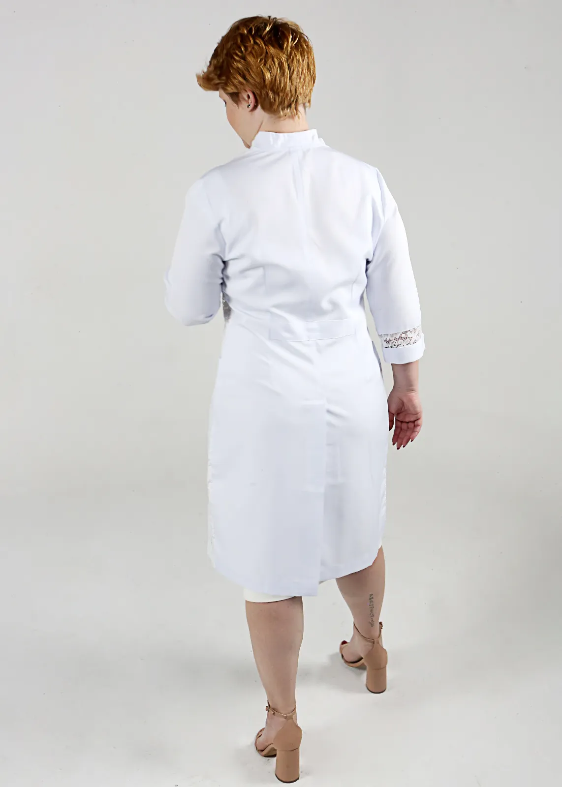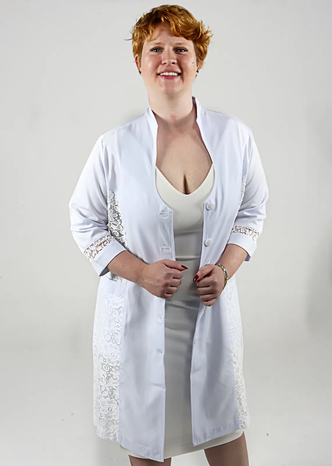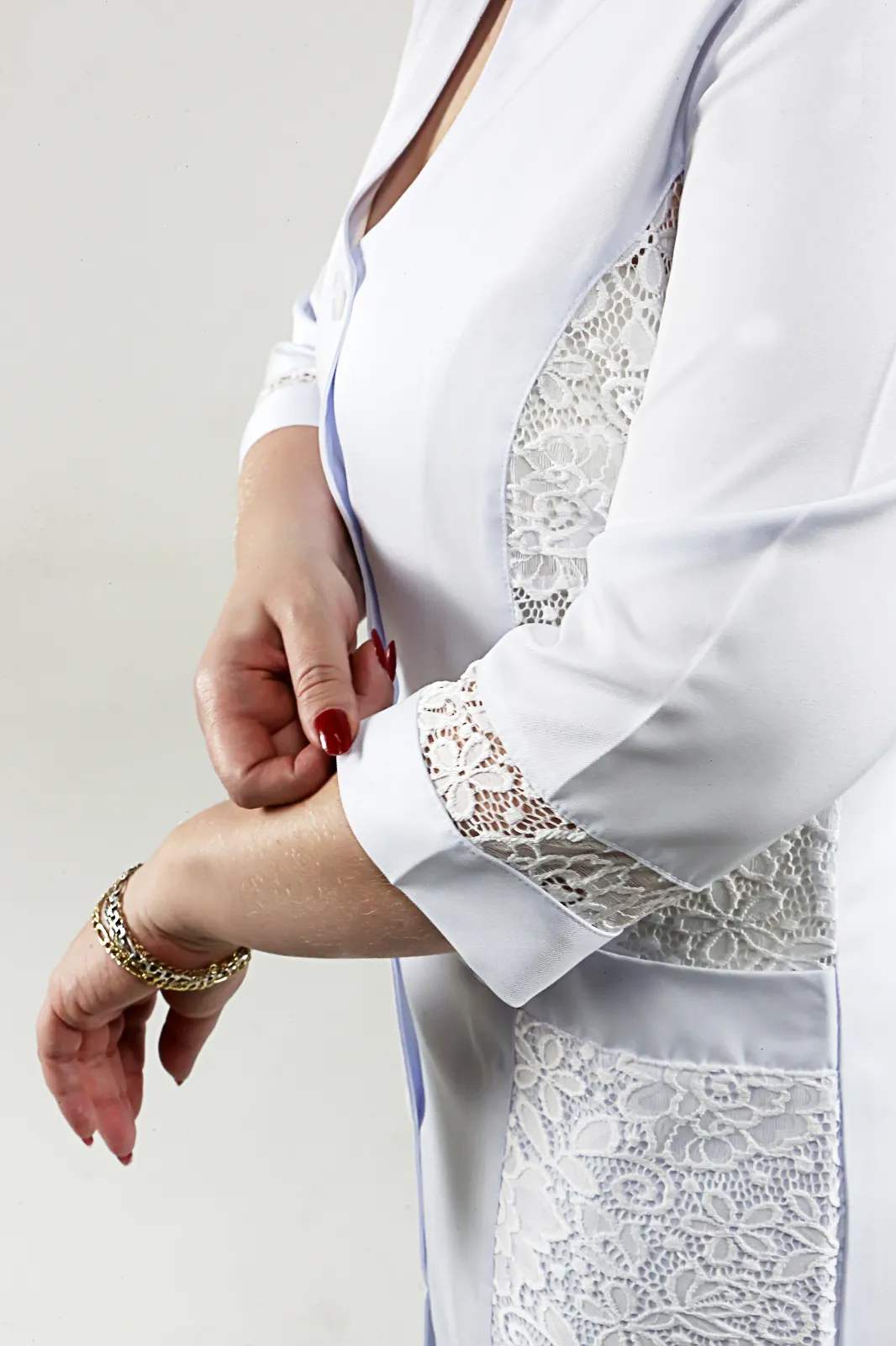 Jaleco Feminino em Microfibra Acetinada de textura macia que oferece durabilidade, conforto, caimento, elegância e funcionalidade. Modelo longo acinturado; Gola Alta; Manga ³/4 com detalhe em renda; Bolsos inferiores chapados