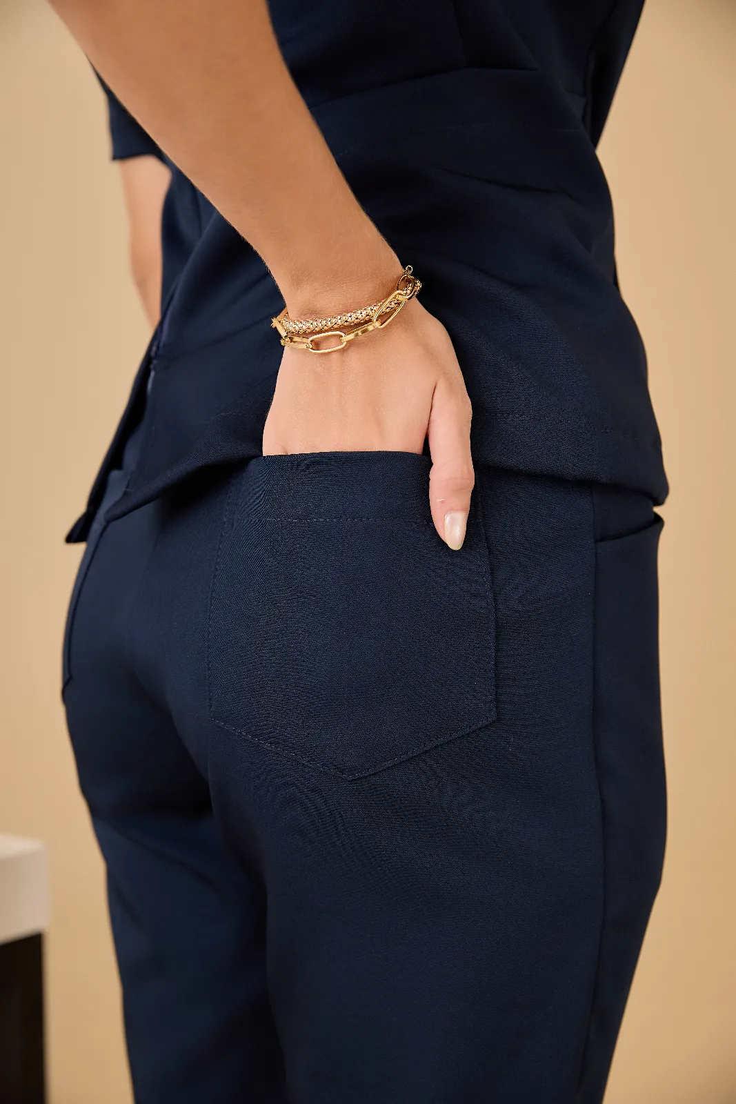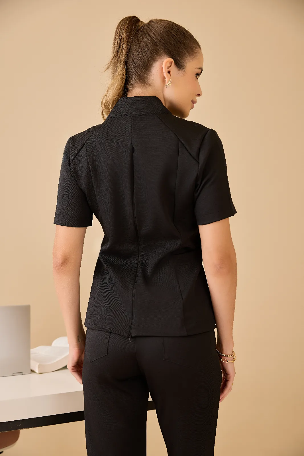 O conjunto Luciana tem um design moderno e estruturado. A blusa apresenta um decote V com detalhes conferindo um ar sofisticado e contemporâneo e minimalista, os recortes verticais criam uma silhueta elegante e alongada. O grande diferencial desse modelo são os bolsos frontais, que agregam charme e funcionalidade à peça.