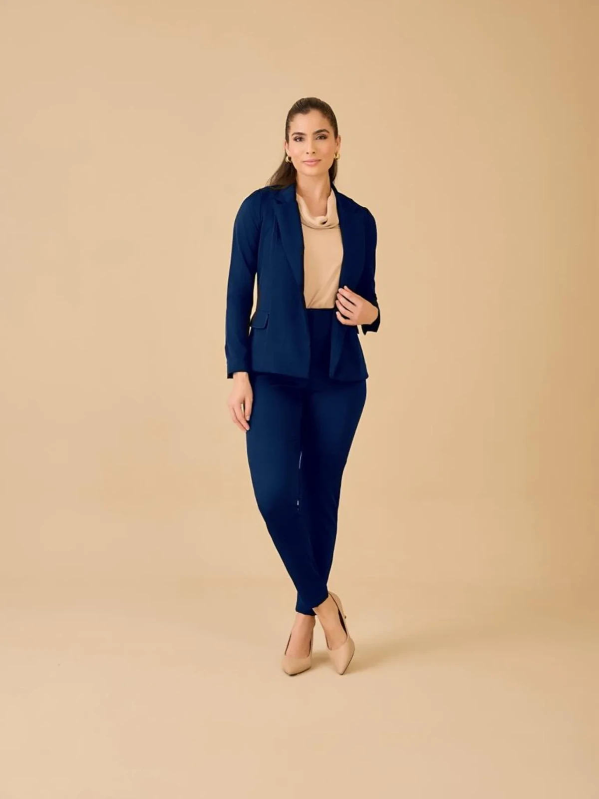 A calça tem cintura alta e modelagem ajustada ao corpo com barra afunilada, que alonga a silhueta e proporciona um visual moderno e alinhado. Perfeita para usar com salto ou sapatilhas, ela acompanha o blazer em uma composição prática e atemporal.