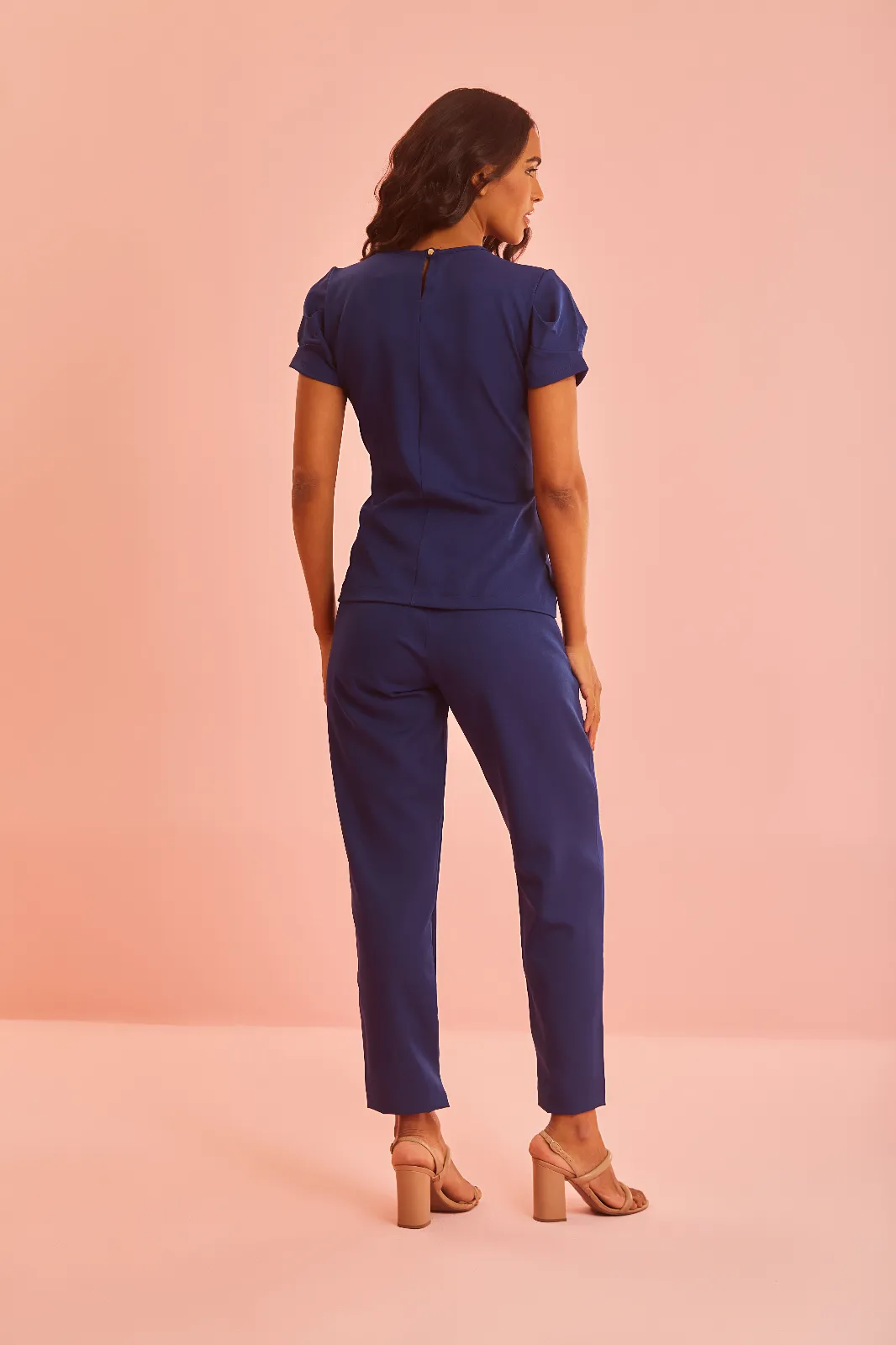 Blusa com gola redonda, manga estruturada. Calça com fecho de zíper e botões, elástico na cintura que proporciona mais conforto para o dia a dia. Dois bolsos frontais, duas pregas que dão um charme e elegância no caimento da peça. Um botão na perna da calça, super charmoso.