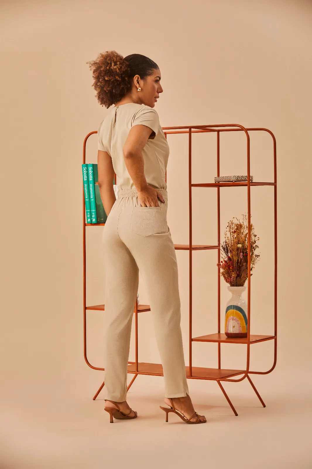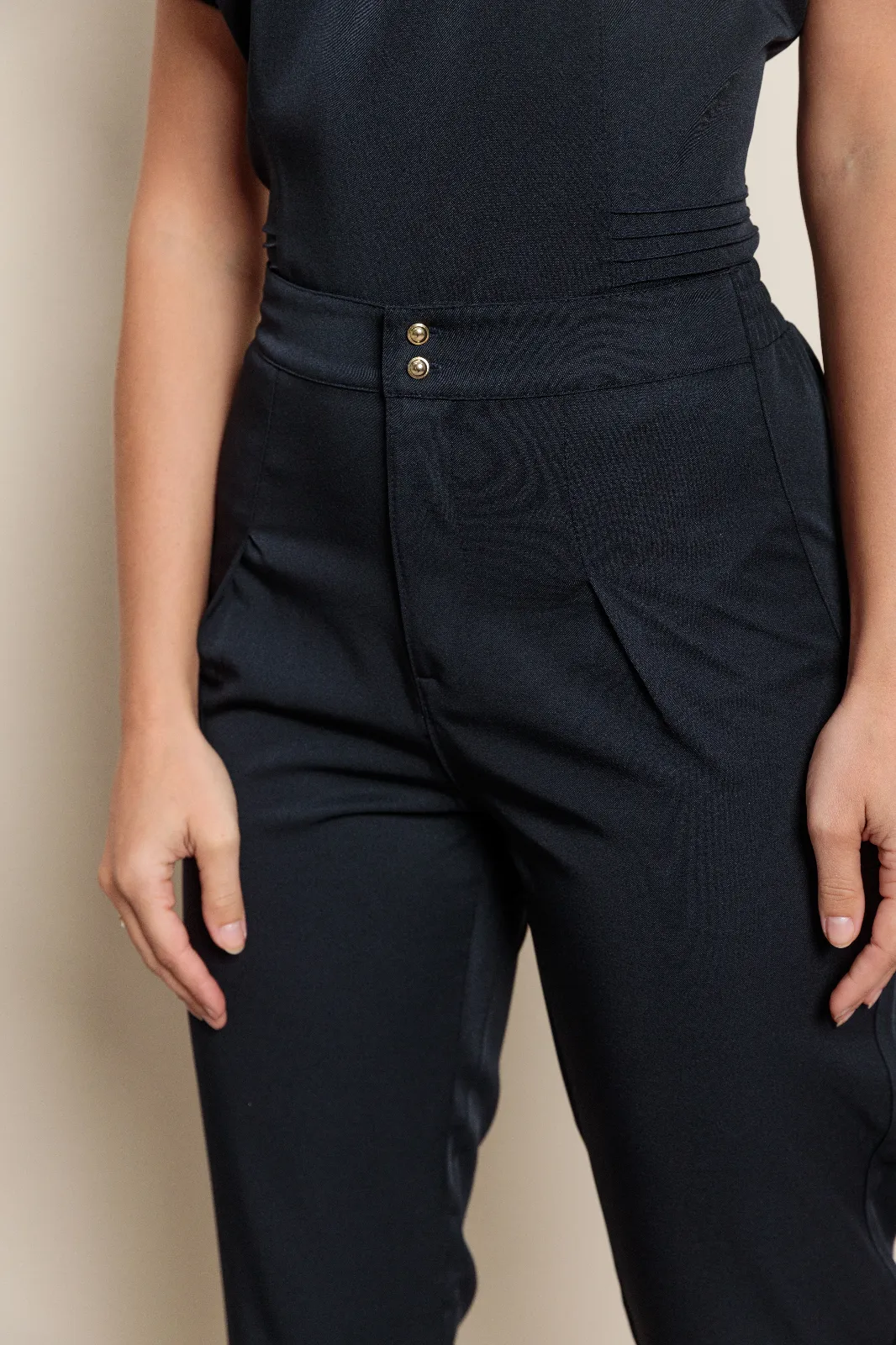 Gola com recorte charmoso e delicado. Caimento perfeita, que modela a cintura. Detalhes de pregas que dão um charme e elegância acima dos dois bolsos. Botão nas costas. Calça com elástico na cintura, que proporciona mais conforto pro dia a dia. Dois bolsos na frente, calça reta.