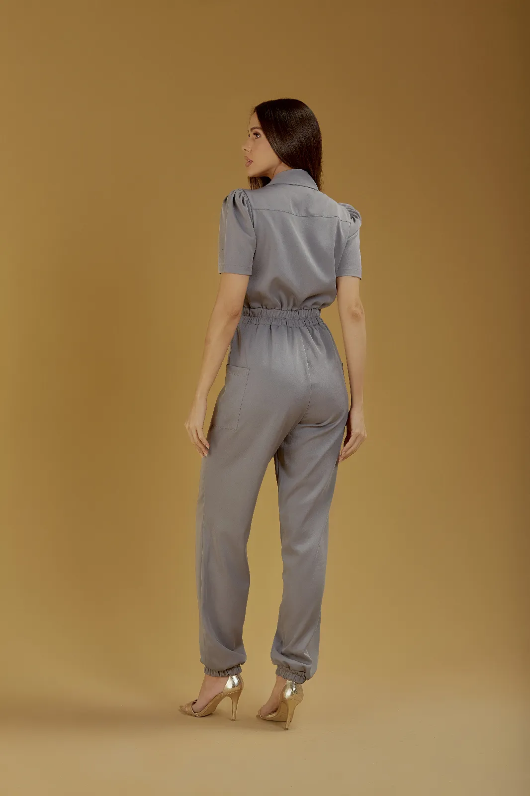 Macacão com gola polo, manga bufante, bolso do lado esquerdo do peito. Zíper até abaixo da cintura com amarração na cintura e elástico nas costas, modelando o corpo. Dois bolsos grandes nas laterais e elástico na perna.
