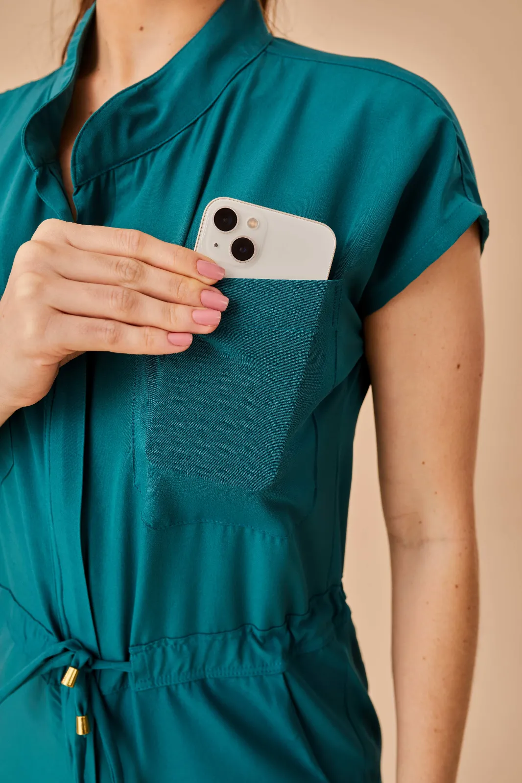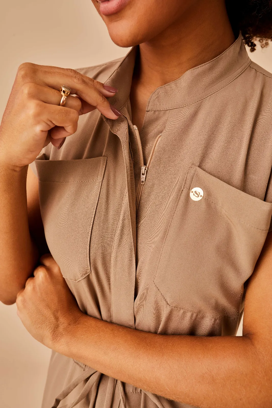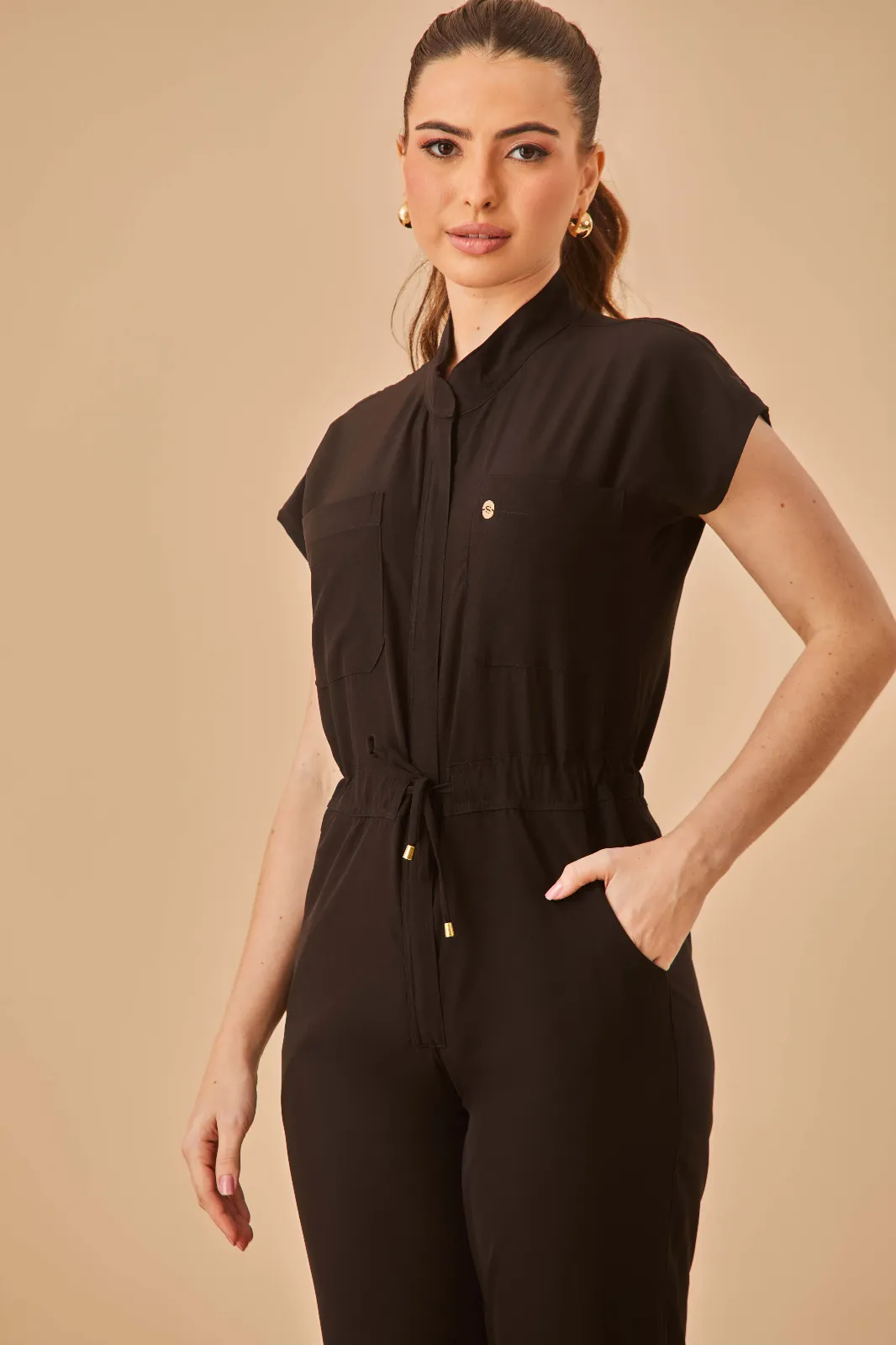 O zíper frontal facilita o vestir e despir, proporcionando agilidade e conforto, especialmente em rotinas dinâmicas. Já a amarração ajustável na cintura permite um caimento personalizado, valorizando a silhueta com conforto e adicionando um toque moderno ao design.