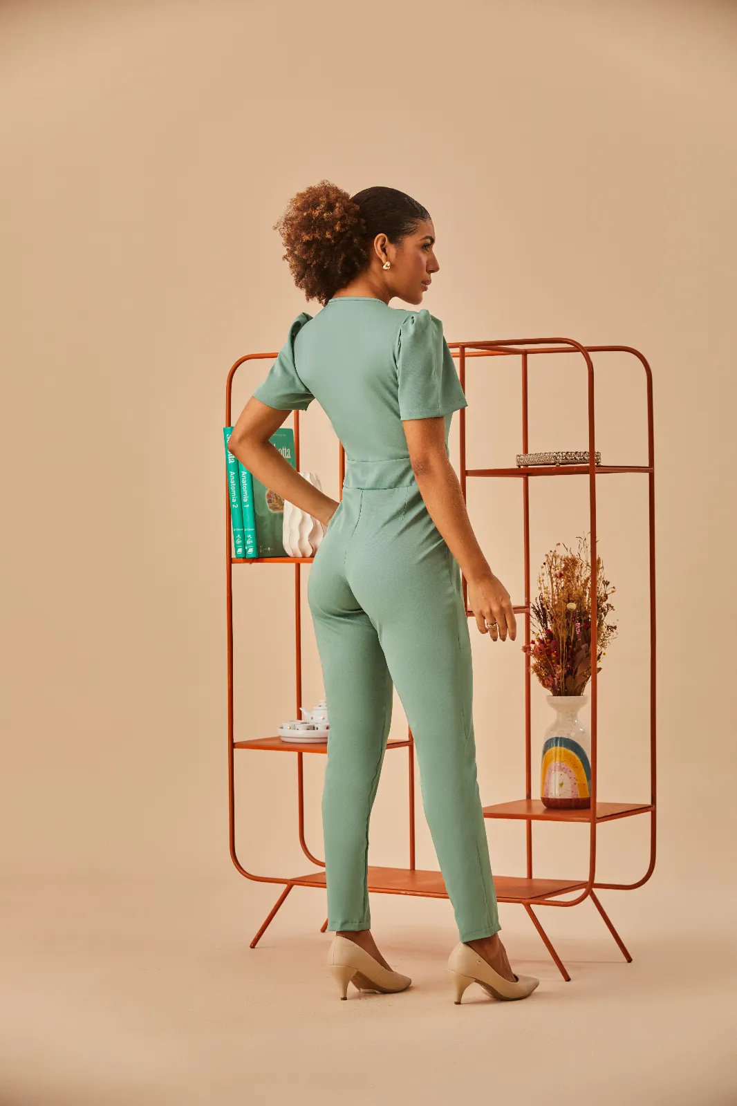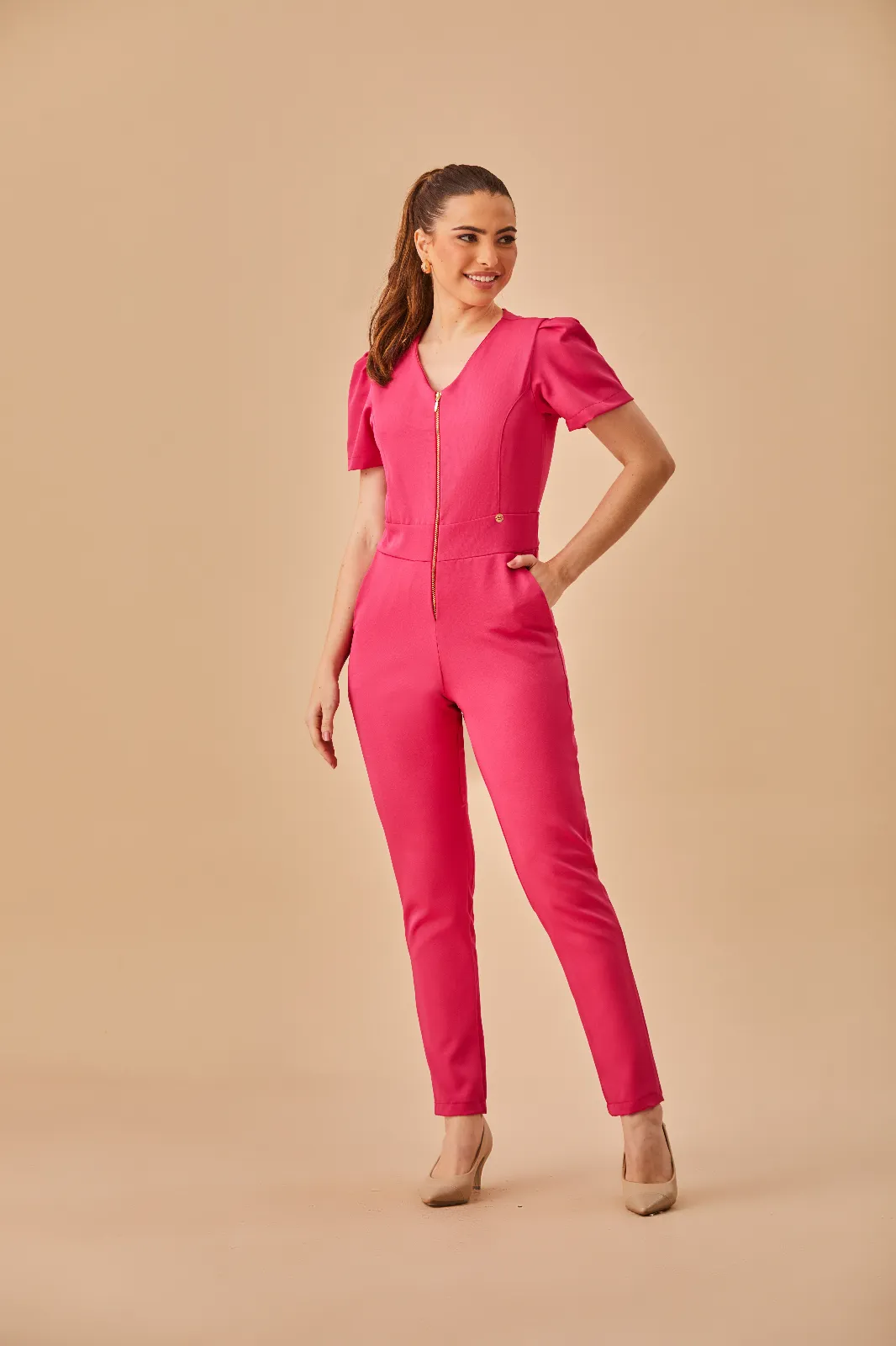 Com gola V e mangas bufantes, o modelo traz zíper frontal até abaixo da cintura, facilitando na hora de vestir. Possui dois bolsos frontais e calça reta para um visual moderno e funcional.