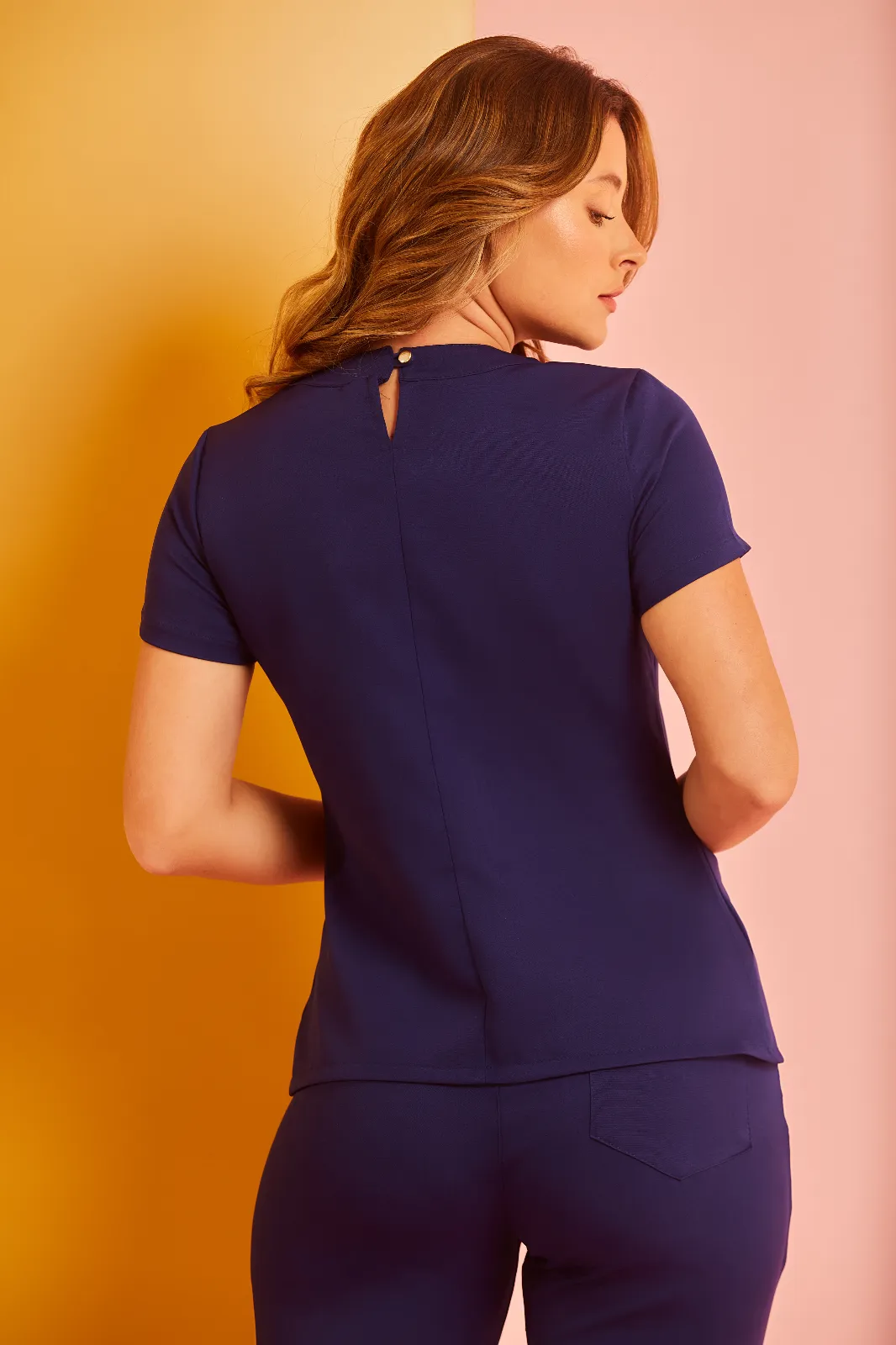 A blusa traz um decote redondo com leve franzido e dois recortes vazados próximos à gola, que criam um charme único sem perder a formalidade. O toque fashion está presente, mas na medida certa!