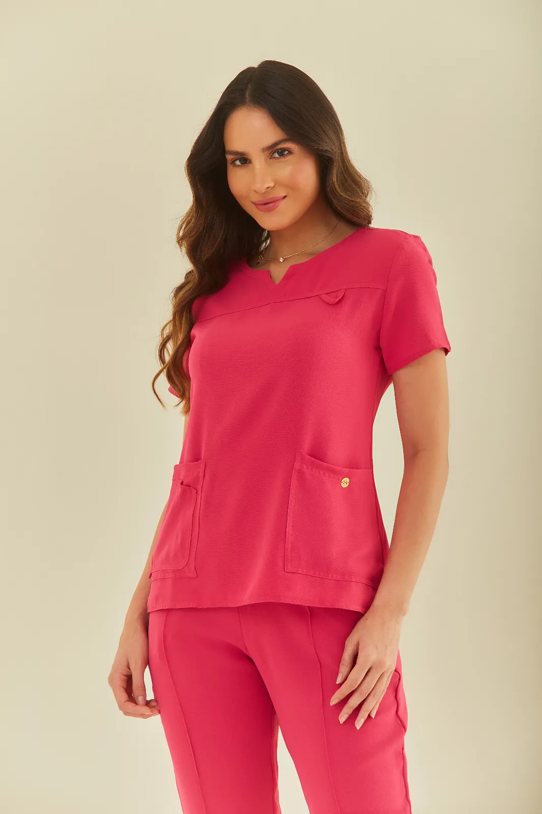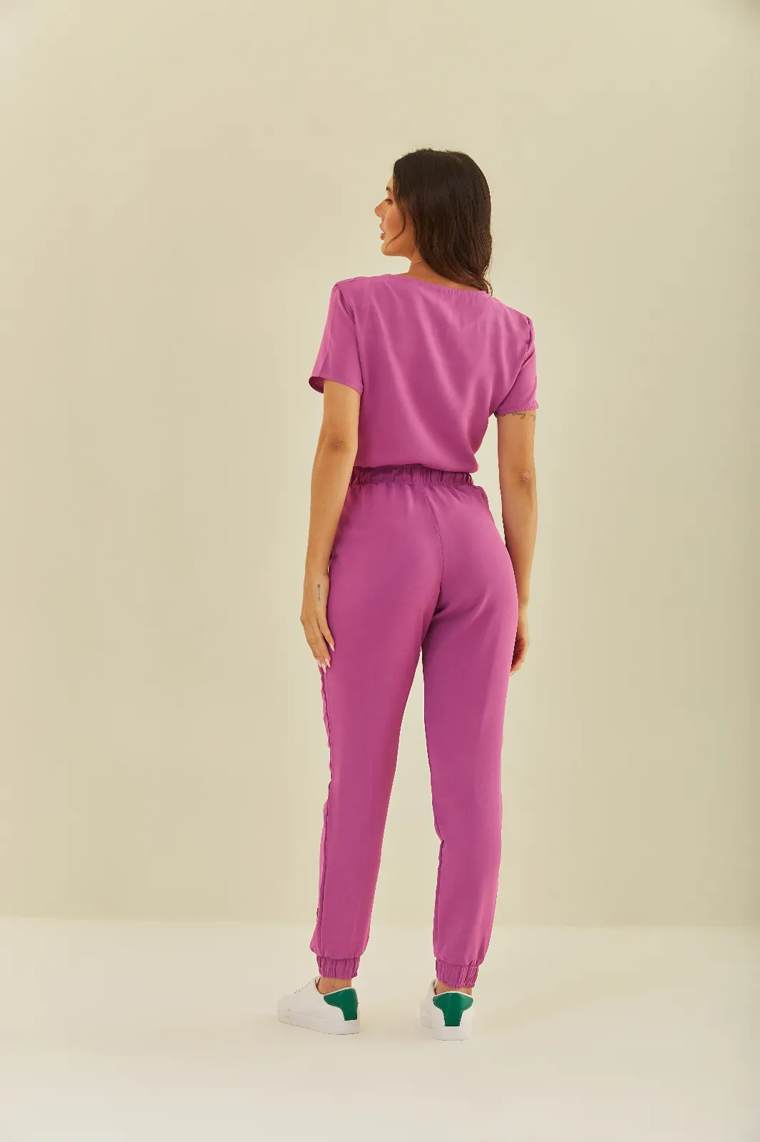 A blusa tem detalhe delicado na gola, porta-crachá, 3 bolsos frontais e espaço para caneta. A calça possui cós com elástico, bolsos frontais e barra ajustada com elástico, garantindo mais liberdade e conforto.