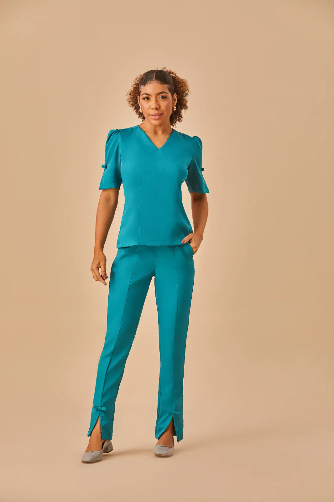 Blusa com decote V, manga bufante com laço e recortes que valorizam a silhueta. Calça com pala, elástico na cintura e detalhe nas pernas que combina com a blusa. Dois bolsos frontais completam a peça.