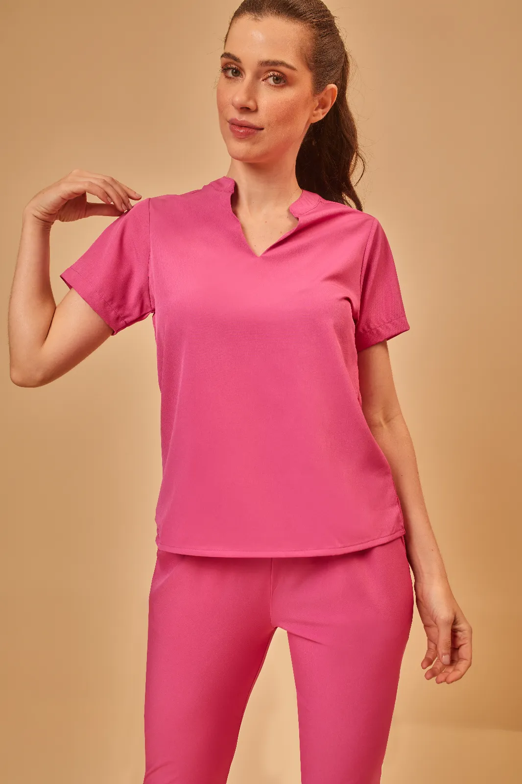 Blusa com gola padre e decote em V. Calça com cintura de elástico, dois bolsos frontais, um traseiro (lado direito) e barra com elástico, garantindo praticidade e mobilidade.