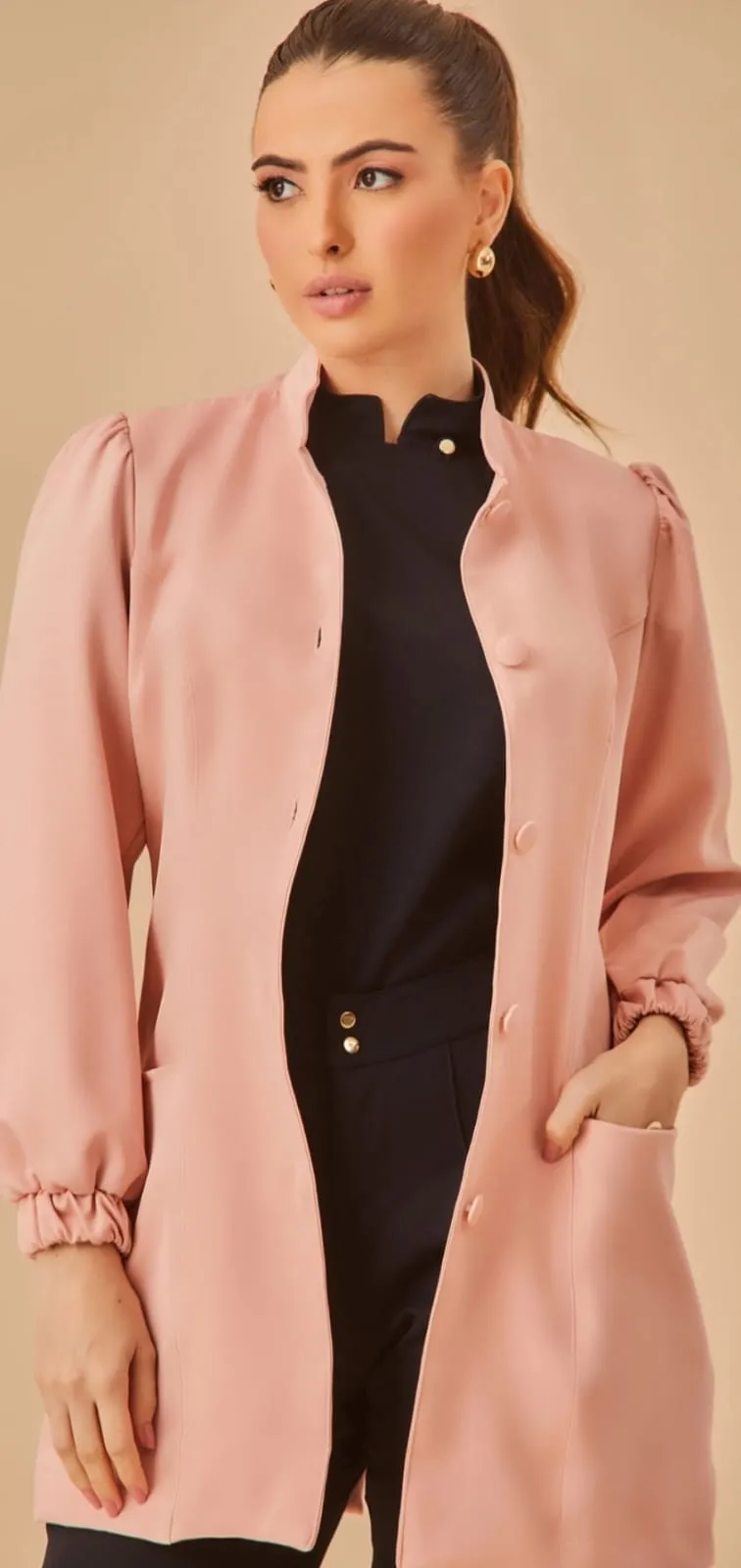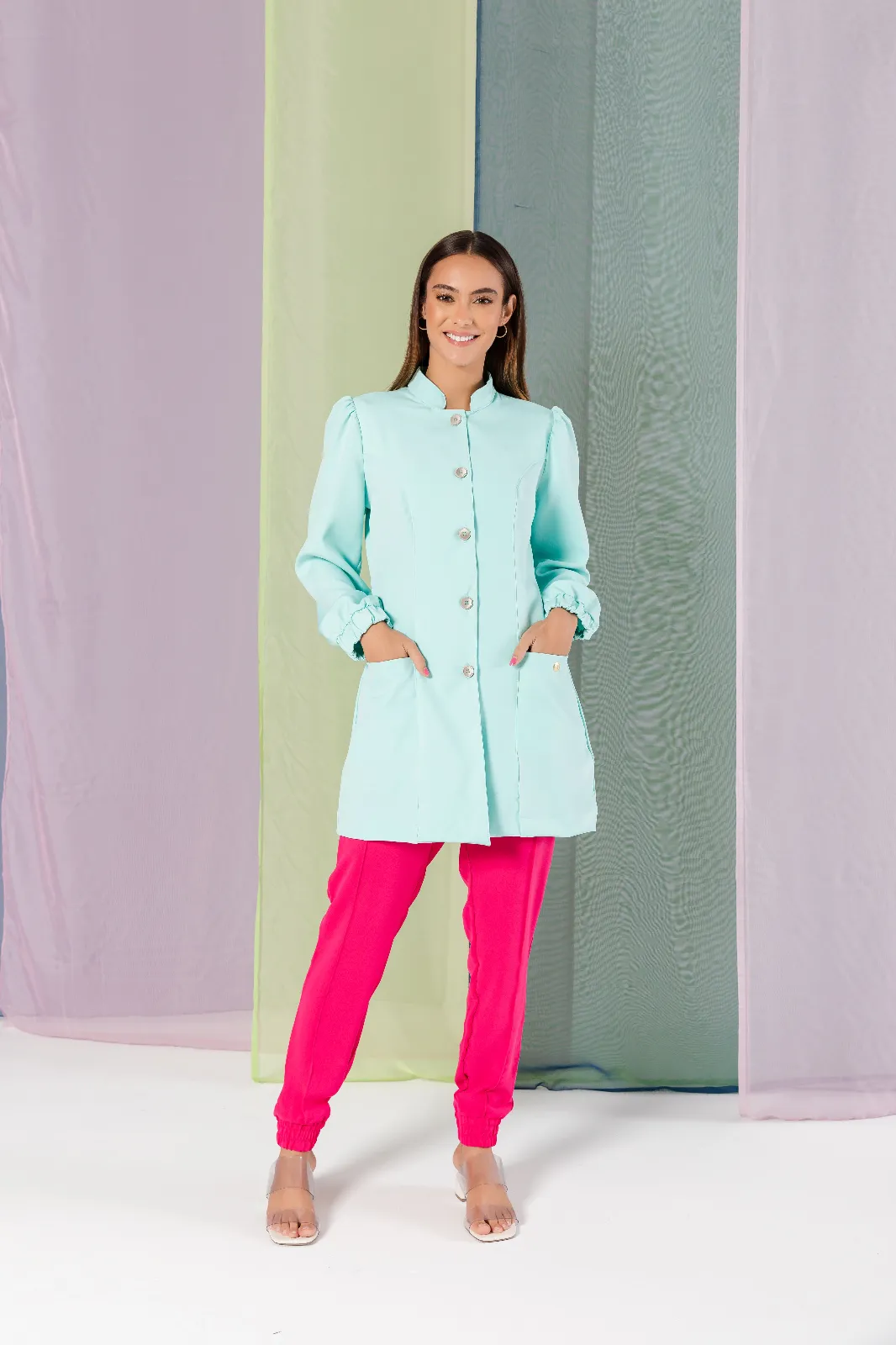 Jaleco gola padre com fechamento alto, dando mais proteção e segurança.Modelagem perfeita, dois bolsos frontais e 5 botões que são forrados com tecido.Manga bufante, que dá elegância a peça e elástico no pulso.