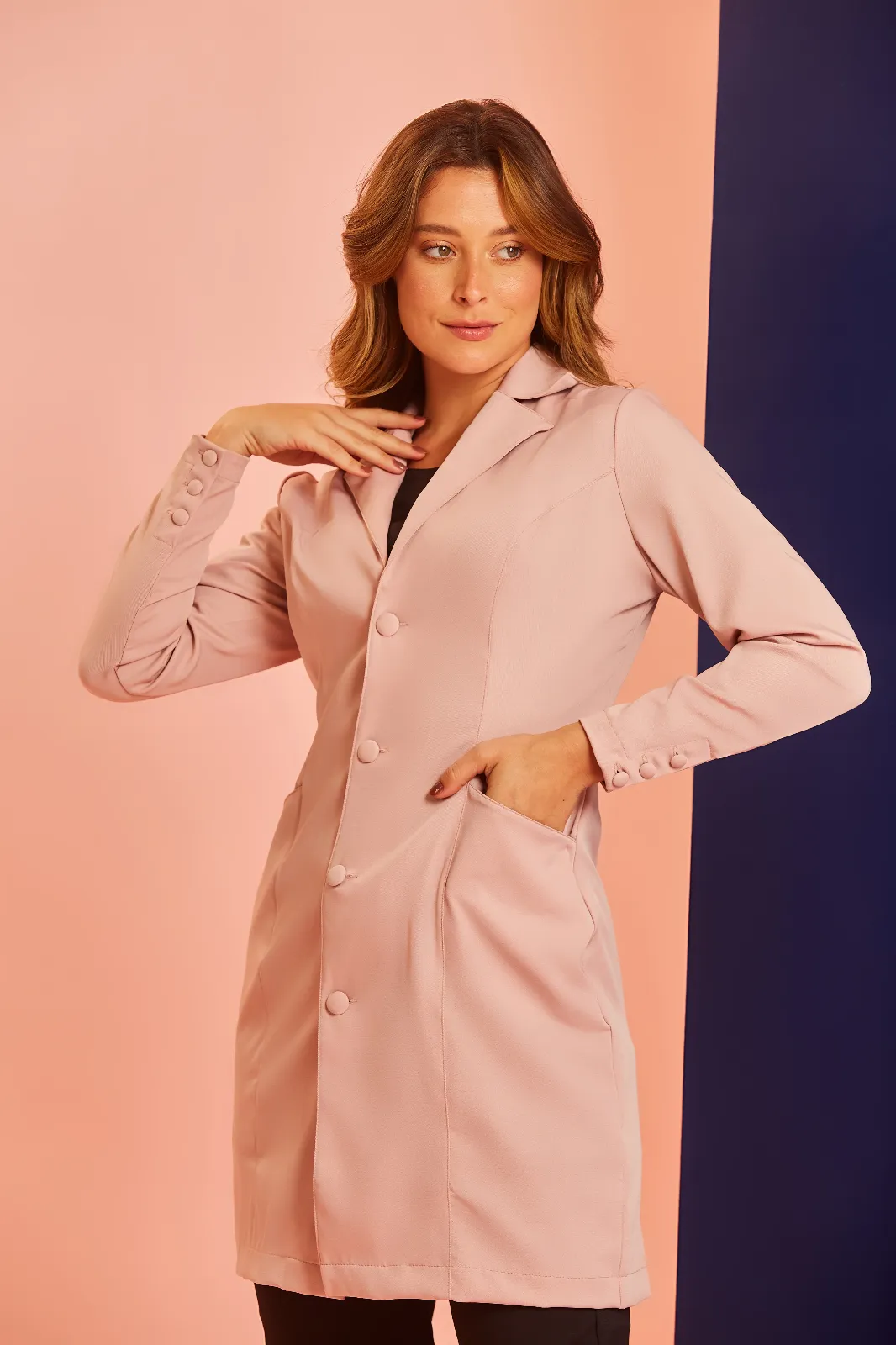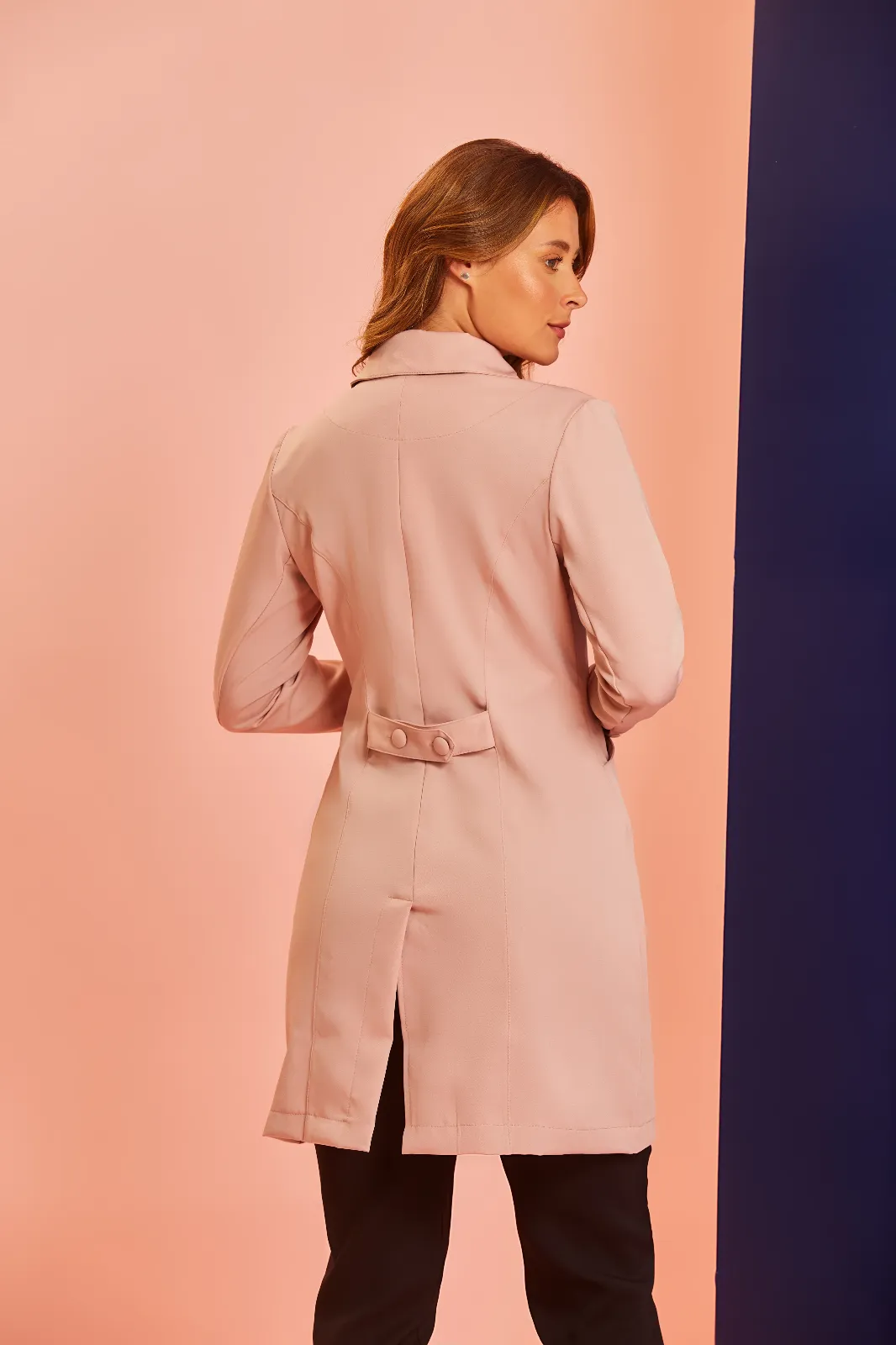 Jaleco gola v, com detalhes na gola que dão charme na peça. Bolso no peito esquerdo, dois bolsos frontais e 5 botões.Faixa nas costas ligada por botões.