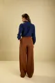Na parte frontal, conta com cós estruturado e fechamento por botão forrado, preservando a estética refinada da peça. As pregas frontais sutis garantem leveza e movimento ao caminhar, enquanto os bolsos laterais funcionais agregam praticidade sem comprometer o design minimalista.